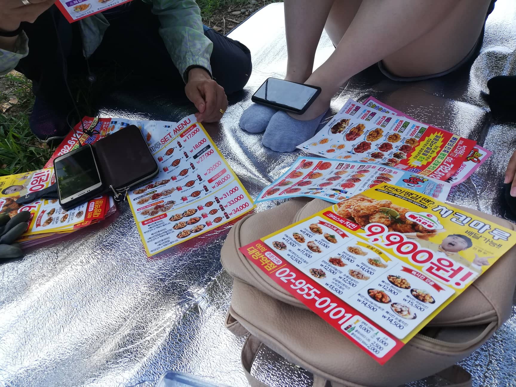A koreaiak számára az igazi kikapcsolódást egy ilyen piknikezés során leginkább a csirke jelenti, ezért a szórólapok 90%-ának választékában csirkét lehetett rendelni.