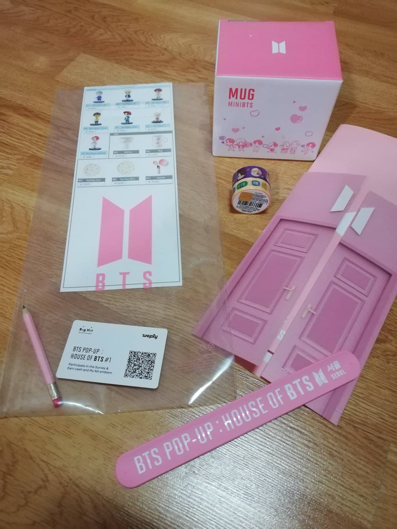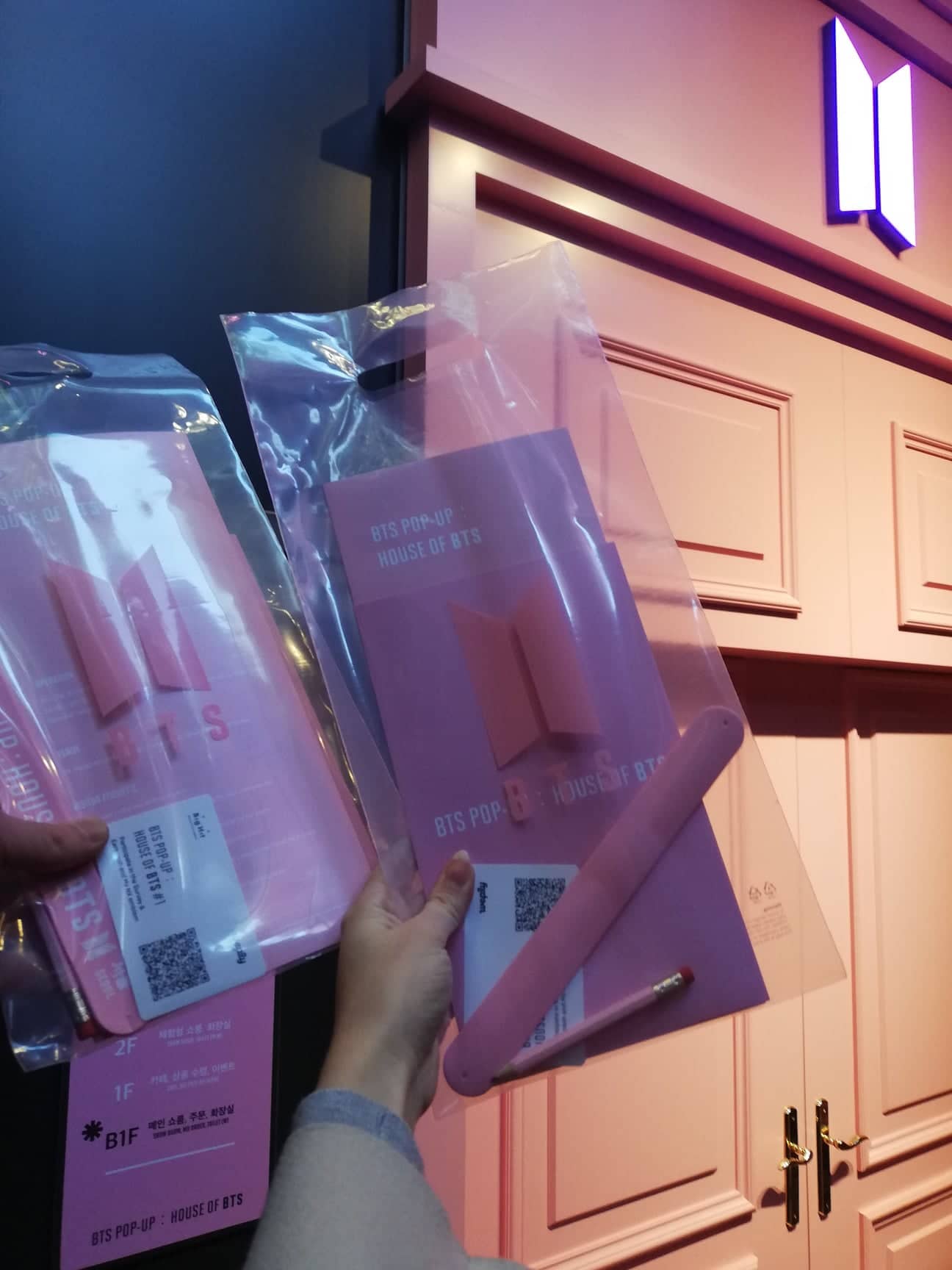 Mielőtt belépnél A házba, sorba kell állnod, mert limitálják a vendégek számát, akiket egyszerre beengednek. A sorban Te már kapsz egy kis táskát, benne: BTS ceruza, pecsét-könyv, karperec, és egy katalógus a bent megtalálható termékekről, amit megvehetsz.